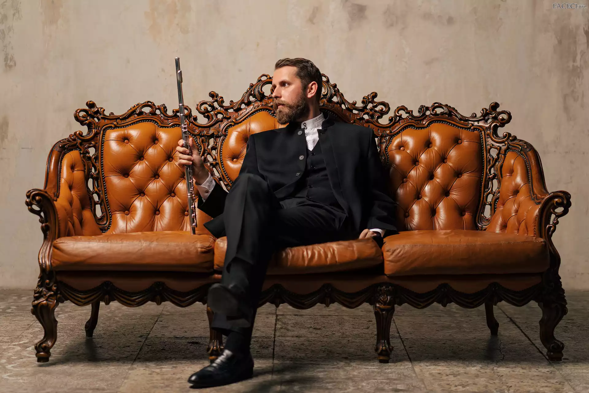 Kanapa, Wąsy, Mężczyzna, Flet, Sofa, Broda, Garnitur - faceci.biz